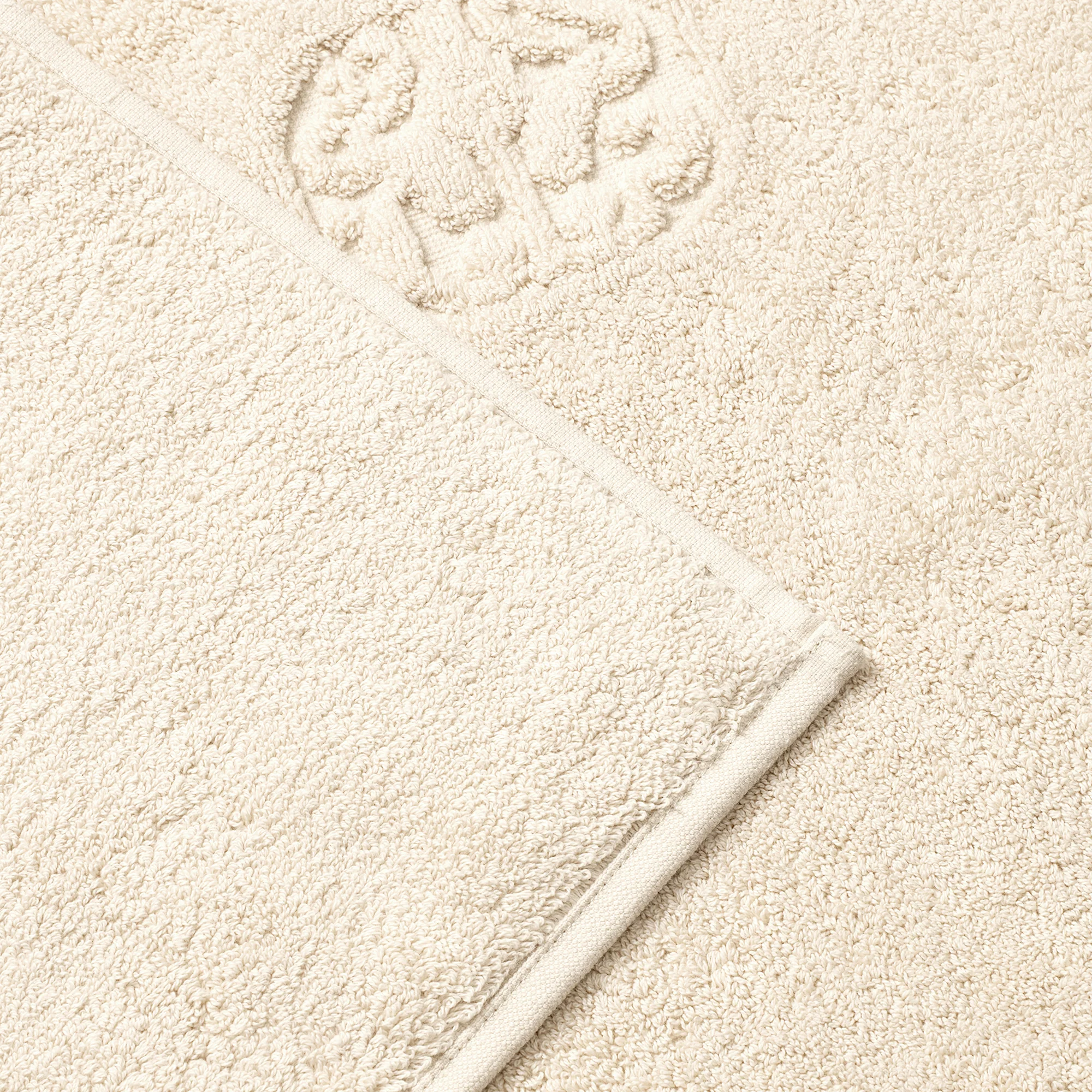 Damask Terry bademåtten har et enkelt udtryk med Georg Jensen Damasks ikoniske logo indvævet som elegant detalje. Archive Linen er en lys beige farve med referencer til linned fra vores århundreder gamle arkiv.