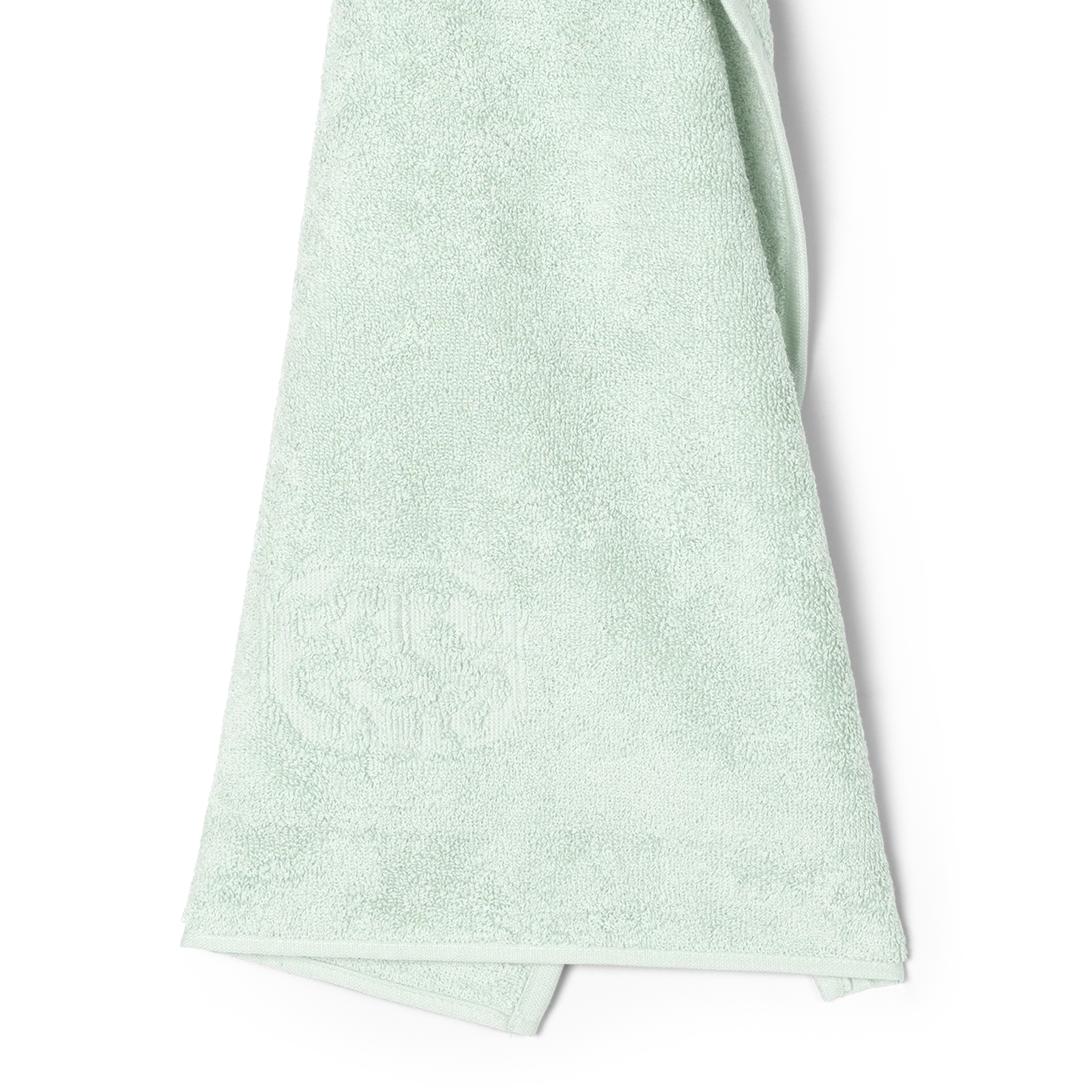Damask Terry gæstehåndklædet har et enkelt udtryk med Georg Jensen Damasks ikoniske logo indvævet som elegant detalje. Den klare, grønblå farve, Glass Green, er inspireret af farven på råglas.