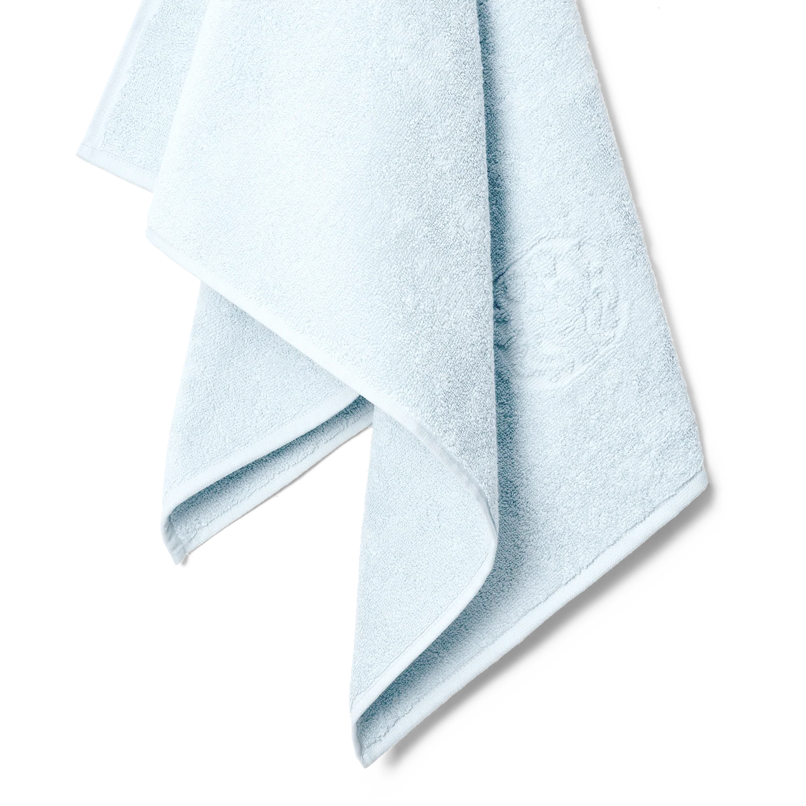 Damask Terry håndklædet har et enkelt udtryk med Georg Jensen Damasks ikoniske logo indvævet som elegant detalje. Minimal Blue er en hel let variant af lyseblå med et strejf af aqua.