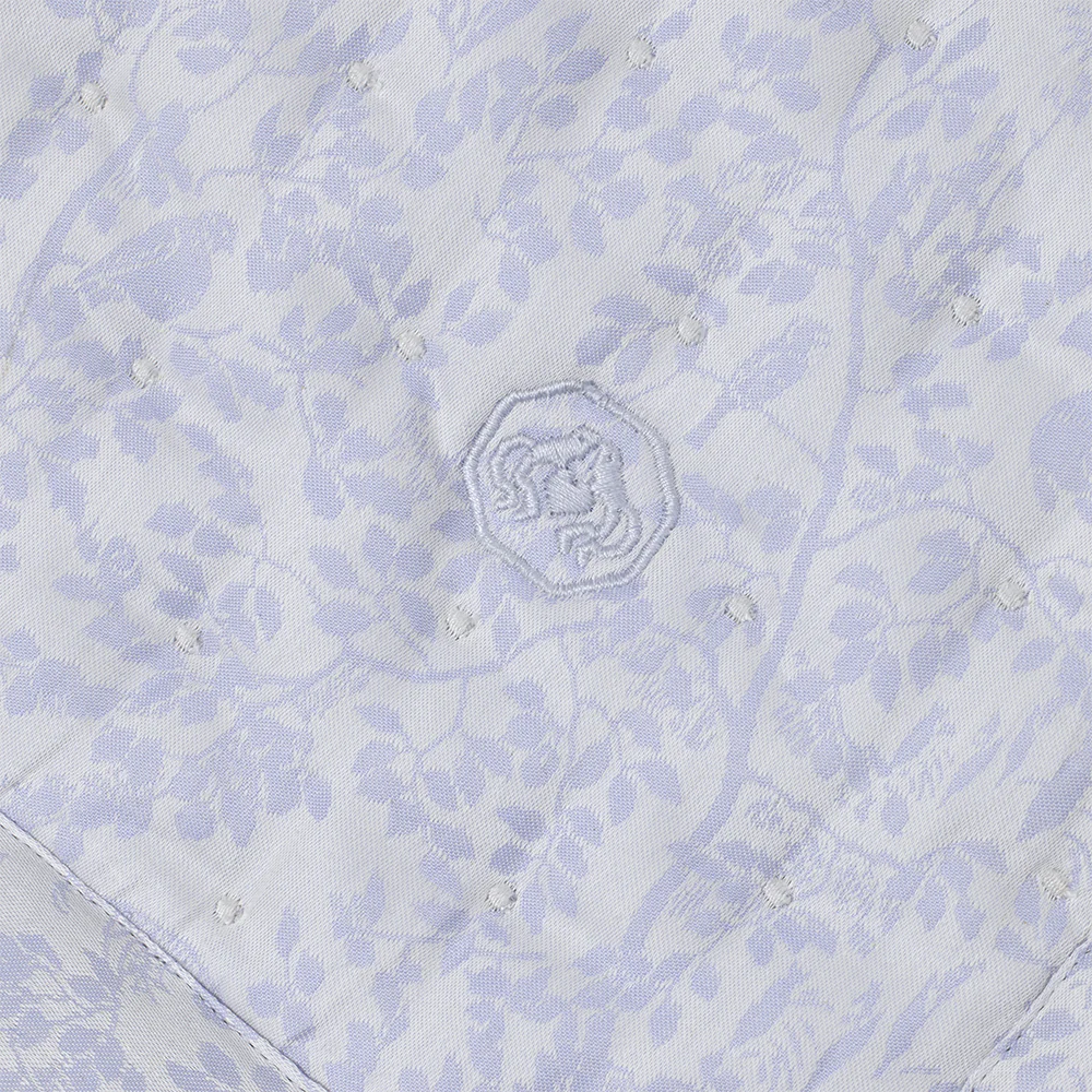Alle produkter har fået broderet et lille Georg Jensen Damask-børnelogo. Clear Blue er en lys, let støvet blå farve.