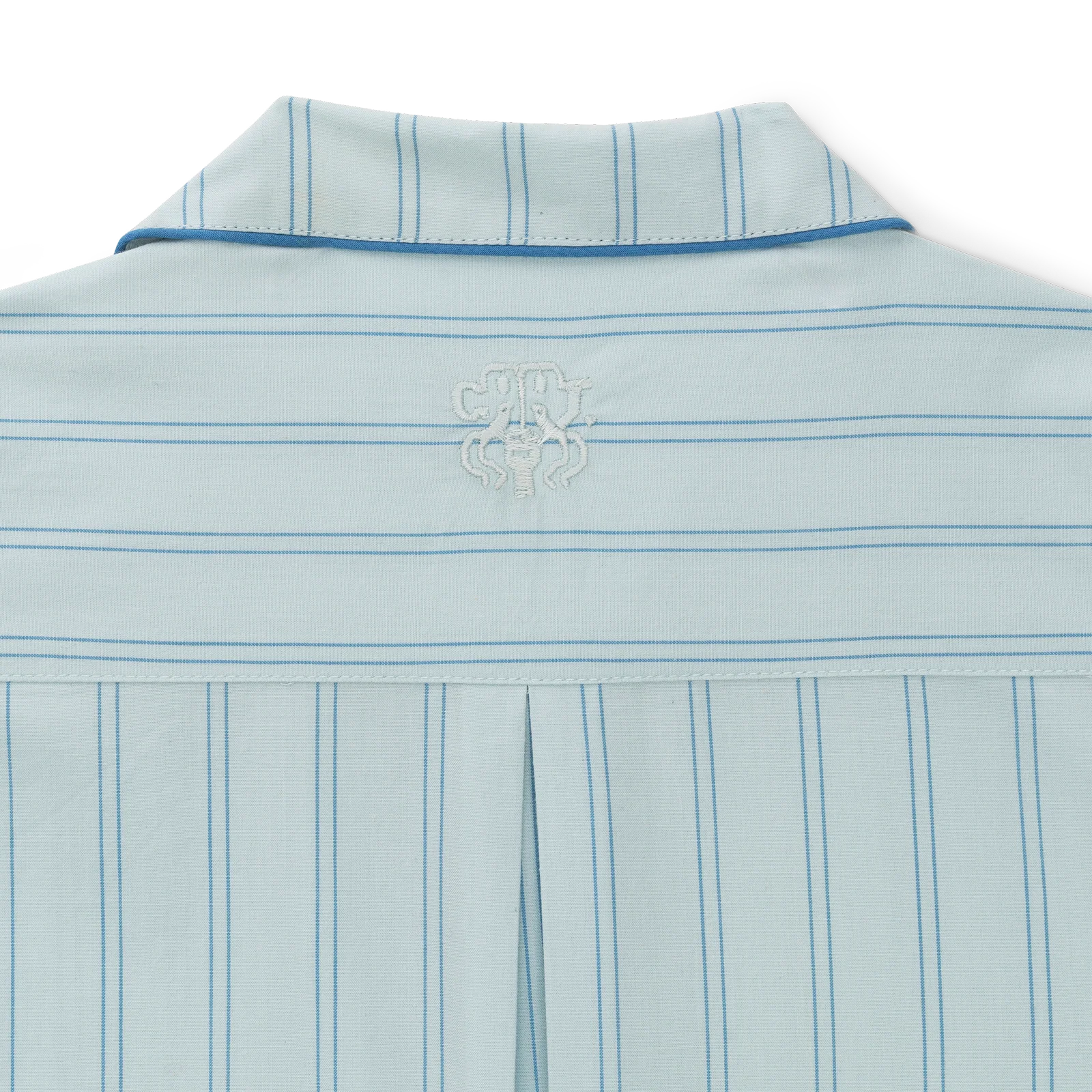 Unisex pyjamas til børn percalevævet i supimabomuld. Pyjamassen har et klassisk snit, elegante pipings og slanke nålestriber i Bright Blue med en baggrund i farven Minimal Blue - en helt let variant af lyseblå med et strejf af aqua.