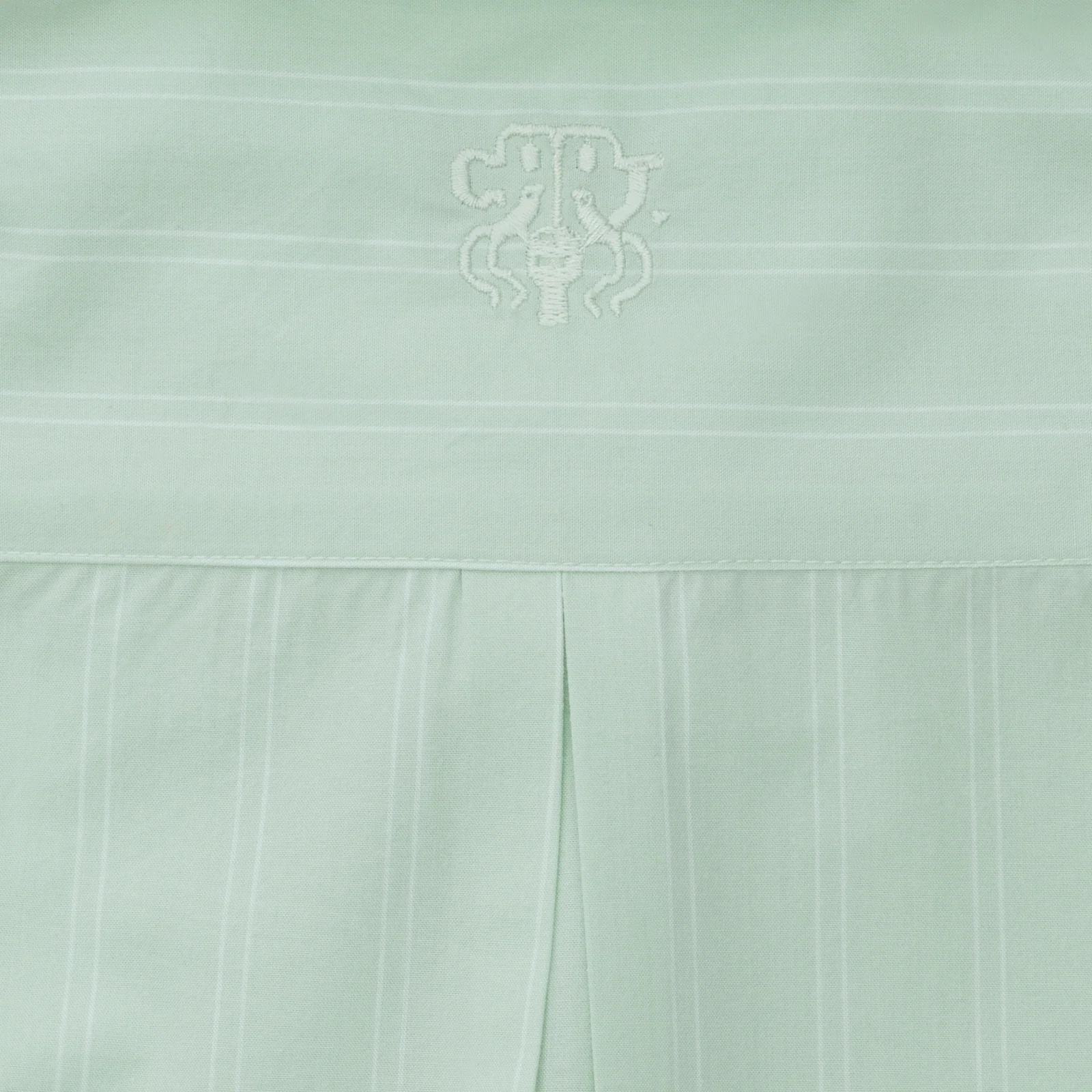 Skjortekjole til børn percalevævet i supimabomuld. Skjortekjolen har et klassisk snit, elegante, hvide pipings og slanke nålestriber med en baggrund i farven Glass Green - en klar, grønblå nuance, der er inspireret af farven på råglas.
